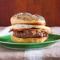 Toast the buns, basting with melted butter. Top the bun bottoms with the burgers, bacon, eggs and bun tops