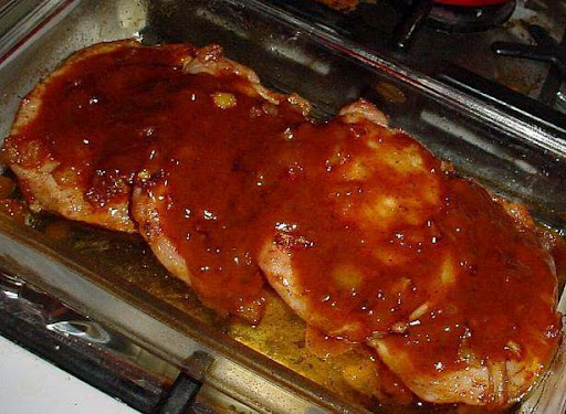 3Combine the other ingredients in a small saucepan and heat until warm; pour over chops.