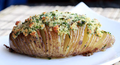 To each potato, using a sharp chef's knife, begin making about 1/4 inch slices, working your knife all the way near the bottom of the potato, but not slicing all of the way through. If it help you, can you lay out two chopsticks, placing the potato in between the chopsticks, and using them as your guide. Make your slices on each potato. Think of this as practicing your knife skills. Take your time and get as precise as you can. Do this for each potato.