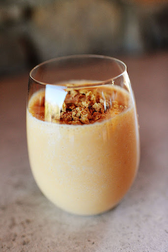 Using pumpkin pie filling, frozen solid before blending, gives the smoothie a lovely built-in sweetness and flavor, and the vanilla yogurt takes the flavor over the top. If you’d like to have a little more control over the sugar in your smoothie, though, you can sub pumpkin puree (make your own; it’s a cinch!) and plain yogurt, then add in whatever sweetener (sugar, honey, agave nectar, orange juice, etc) you’d like.