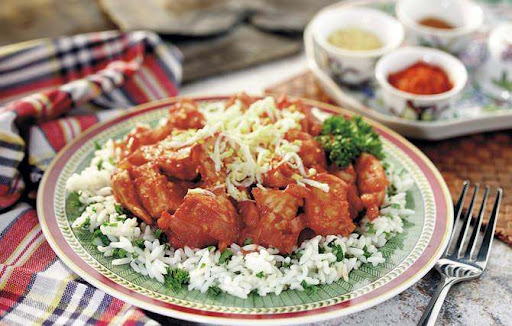 .5Cook over low heat, stirring occasionally, until the chicken is cooked through, about 10 minutes. Stir in salt. Combine rice and parsley in a small bowl and mix well. Spoon onto a serving platter. Spoon chicken mixture on top of rice mixture. Grate egg and sprinkle on top of chicken.