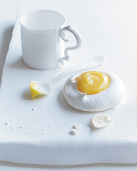 Set the meringues on plates and fill the centers with passion fruit curd. Serve right away, passing extra curd at the table.