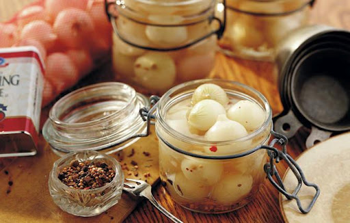 5.Pour vinegar mixture over onions, leaving a 1/2-inch headspace. Seal with 2-piece lids. Process in a hot water bath for 10 minutes. Makes 7 (1/2-pint) jars.