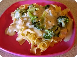 Defrost chicken and sauce. Cook fettuccine according to package directions. Heat sauce in separate pan. I steam my broccoli in the microwave then add it to the sauce. When the noodles are done, I mix it altogether.