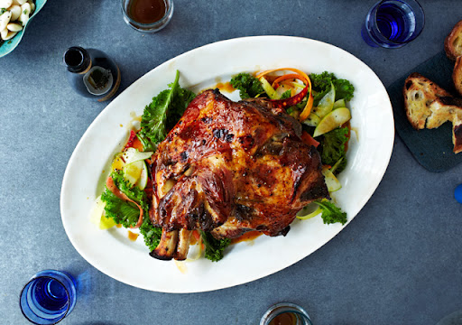 Transfer pan to oven and roast until meat is very tender and falling off the bone (an instant-read thermometer inserted into the center without touching the bone will read 195°), about 5 1/2 hours.