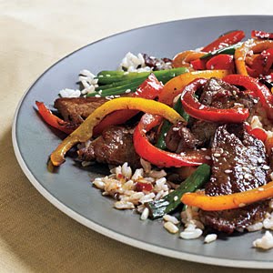 1. Heat a large nonstick skillet over medium-high heat. Add oil to pan; swirl to coat. Add steak to pan; cook 2 minutes, searing on one side. Add bell peppers; cook 2 minutes or until beef loses its pink color, stirring constantly. Remove beef mixture from pan.