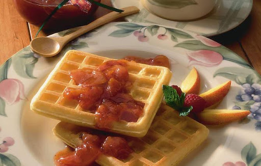 Since frozen peaches are available all year long, Grandma would make several big batches of Spiced Peach Sauce at holiday time for gift giving. Whether she gave a jar of sauce by itself or packaged it in a decorative basket along with a jar of her buckwheat waffle mix and a pretty dish towel, Grandma always included a handwritten card with the sauce recipe. She loved sharing her tradition with others.