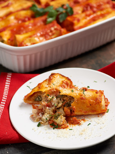 Pace half of the sauce in a 13" x 9" baking dish. Place 1 pasta sheet on a flat work surface. Take about 1/3 cup of the filling and spread it lengthwise along the center of the pasta. Roll the noodle into a cylinder and place it in the baking dish seam-side-down. Repeat with remaining pasta sheets and filling.