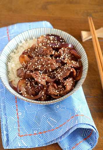Prepare the rice as you normally would in a rice cooker or pot while you prepare the beef.