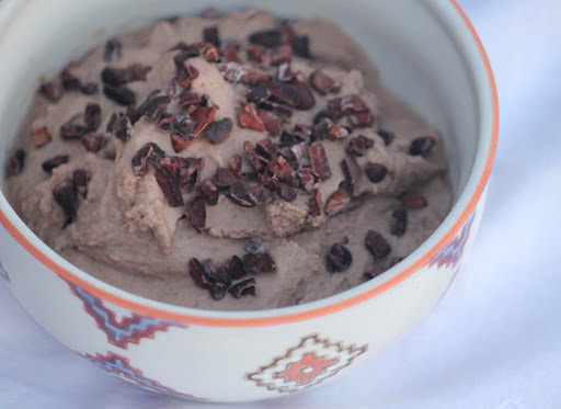 Place all ingredients except for the cacao nibs in a high-speed blender (such as a Vitamix) and process until very smooth and creamy.
