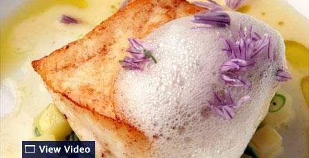 Add the garlic scapes to the potatoes and adjust the seasoning. Divide the potatoes and their broth among 4 warmed soup bowls. Place the fish on top. Garnish with the optional chive blossoms, spoon a bit of the lemon foam over, and serve immediately.