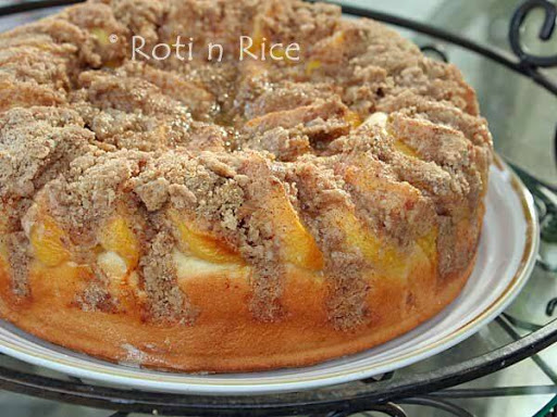 Lightly oil a 9-inch spring form cake pan. Peel and slice peaches into ½-inch slices. Mix all topping ingredients in a medium sized bowl until mixture resembles coarse breadcrumbs.