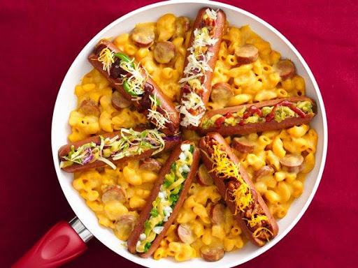 3 Cut lengthwise slit in each of remaining 6 hot dogs; place over macaroni mixture in skillet. Cover; let stand until hot. Serve in bowls; fill slit in each hot dog with customized toppings as desired.