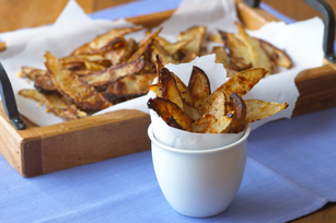 Heat oven to 425°F. Wash potatoes; pat dry with paper towels. Cut into 1/4-inch-thick sticks; place in large bowl. Add remaining ingredients; toss to coat.