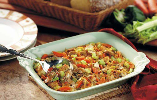 .3Spoon the celery mixture into an 11x7-inch baking dish. Layer with the turkey and mushrooms.