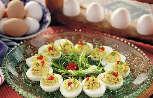 .4Spoon or pipe equal portions of egg yolk mixture into egg white halves. Chill, covered, for 1 hour. Garnish with pimiento, if desired.