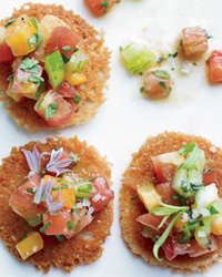 Chopped red, green and orange tomatoes are tossed with olive oil and herbs, then served on Parmesan tuiles. The result: a supremely colorful, incredibly easy hors d'oeuvre
