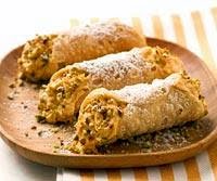 3. *Note: If purchased cannoli shells are not available, brush one side of sixteen 4-inch flour tortillas (trim larger tortillas if necessary) with cooking oil. Roll, forming a tube shape; secure with a wooden toothpick. Gently place a rolled piece of foil in the center for support. Place on a baking sheet; brush outside with oil and bake in a 375 degree F oven about 15 minutes or until golden brown. Place on a wire rack to cool. Remove foil and toothpicks; fill with pumpkin mixture. Makes 16 shells (allows for breakage).
