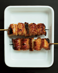 Trim the chicken thighs of visible fat and cut into 1-inch pieces. Thread 2 pieces of chicken onto a skewer, followed by 1 piece of scallion and 2 more pieces of chicken. Repeat to skewer the remaining chicken and scallions. You should have 8 skewers.