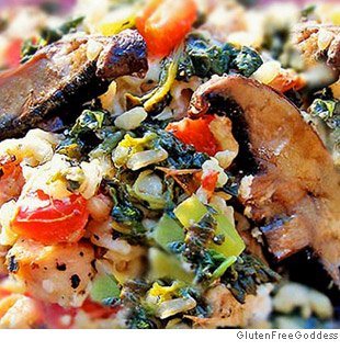6. Add the cooked chicken and the Portobello to the spinach mixture. Spoon on the rice. Top with the remaining spinach, tomatillos, tomatoes and garlic. Add the remaining sliced mozzarella and goat cheese. Put the pan in the oven. Bake until done, about 25 to 30 minutes, till heated through.