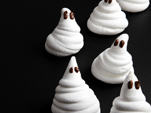 Put the chocolate chips in a microwave-safe bowl; microwave on 50 percent power until melted, about 1 minute, stirring halfway. Transfer the melted chocolate to a zip-top bag and snip a corner. Pipe the chocolate on the meringues to look like eyes.