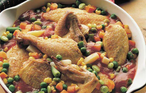 .6Add tomato sauce, broth and sugar; cook until liquid comes to a boil. Add vegetables and chicken pieces; cover and cook until vegetables are tender, 10 to 12 minutes. Serve hot.