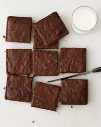 Preheat the oven to 350°. Butter a 9-inch square baking pan with 1/2 teaspoon of the butter. Sift together the flour, cocoa, baking powder and salt.