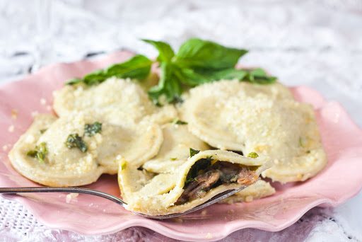 Prosciutto and Mushroom Ravioli with Basil Browned Butter Sauce