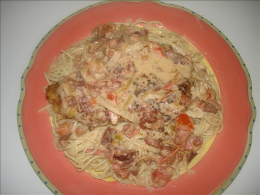 1 Cook pasta; drain. (While it is cooking, prepare chicken and veggies, and then sauce.). 2 Chicken: Dredge chicken in seasoned flour; melt about 2 tablespoons butter and 2 tablespoons olive oil in large skillet. Cook chicken until lightly browned and just cooked through (don't overcook, or it won't be tender). 3 Remove from pan, and keep warm. 4 Veggies: Saute the onions (in the remaining butter/oil) until fairly tender. (You could add mushrooms at this point, if desired.) Then add bacon and tomatoes, and toss until heated through. Remove from pan, and add to drained spagetti noodles. 5 Sauce: Heat the lemon juice and wine to a boil; simmer and reduce by 1/3. Add cream and simmer until thickened (3-4 minutes). Slowly add butter, and stir until completely melted. Season with salt and pepper. 6 Place chicken tenders atop the noodles, pour on the sauce, and gently stir to completely mix all ingredients. 7 Update: I tried this, using prebreaded/precooked chicken breast strips (the real thing, not "formed"), which I thawed slightly, and then cooked in the pan (as in the original recipe). I also subbed real bacon bits, for the precooked bacon slices, and chopped tomatoes (from a jar). This cut out some time and steps, and it was still great! I only used 2 sticks of butter, and it's still plenty rich, too.