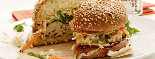 To assemble your burger, generously spread the top and bottom buns with Thai mayonnaise. Place the grilled chicken burger on the bottom bun and top with 1/2 cup of slaw mix. Lean the top bun against your burger for a nice presentation.