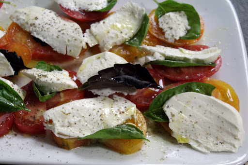 The perfect summer starter, a mix of heirloom tomatoes, fresh basil and fresh mozzarella. Try mixing different colors of tomato and basil for added visual appeal.