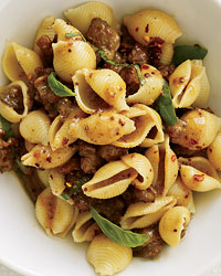 In matching spicy sausage with a creamy mustard sauce and fragrant basil, British cookbook author Nigel Slater created a quick pasta supper with warm, mildly spicy flavors, perfect for a cool fall or winter evening.
