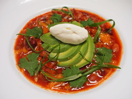 11. Finish with sliced avocado, non-fat sour cream, sliced scallion, cilantro leaves, and low-fat shredded aged cheddar (optional).