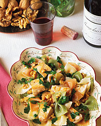 In a large pot of boiling, salted water, cook the bow ties until just done, about 15 minutes. Drain the pasta and toss it with the walnuts, the chicken-and-vinaigrette mixture, and the watercress. Serve warm.