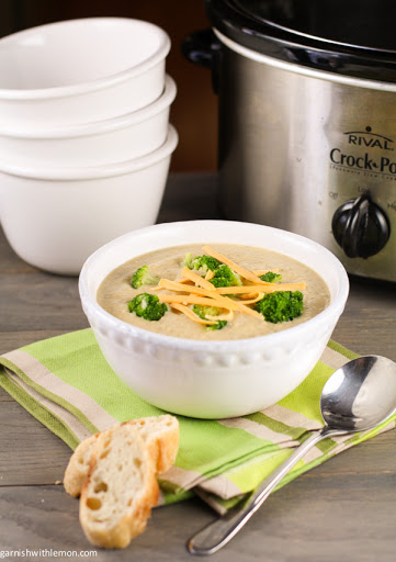 Pour mixture into Crock Pot. Stir in broth, broccoli, pepper and salt. Cover; cook on low heat setting for 4 hours or until bubbly.