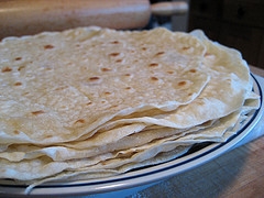 Divide the dough into 12 equal portions (makes 12 tortillas) and form these into balls. Place the balls between waxed paper and using a rolling pin, press into thin, round 5 inch diameter pancake-like shapes.