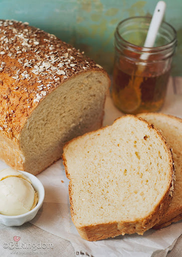 When the loaf is doubled again, brush the top with the warmed honey and sprinkle with the oats.