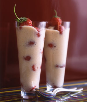 Beat eggs in a large deep metal bowl with a handheld electric mixer at medium-high speed 1 minute, then add hot rhubarb purée in a stream, beating constantly. Put bowl over a saucepan of simmering water and beat until mixture is tripled in volume, very thick, and registers 160°F on thermometer, about 6 minutes. Remove from heat and ladle sabayon over strawberries. Serve immediately.