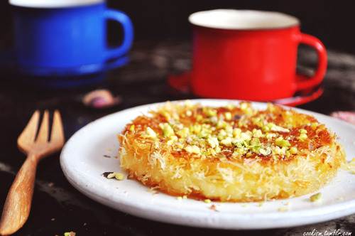Our perception of the world of desserts was irrevocably turned upside down when we tasted our first künefe. Who would’ve known (maybe besides the Turkish) that such a divine fusion of art and delicacy exists? The uber-crisp shreds of phyllo dough sandwich a strata of savory, stringy cheese, and the whole mishmash of textures is doused with the syrupy nectar of gods to create an unforgettable dessert, with every morsel an explosion of flavours and unspeakable sensations. We have created a recipe that, albeit not the most traditional, is one that we simply love.