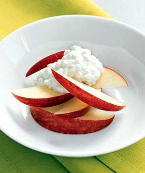 Slice an apple, such as Fuji or Granny Smith, and top with ½ cup of low-fat cottage cheese (look for 4-ounce four-packs from Breakstone). Or replace the fresh apple with two drained cinnamon-spiced apple rings, such as Musselman's (which can be found in the canned-fruit aisle).