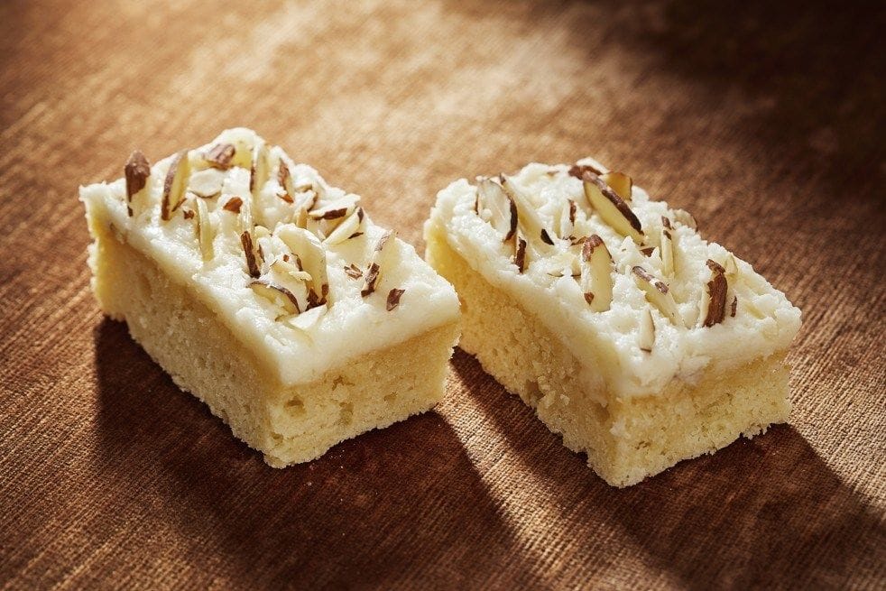 Use the parchment underneath to slide the bar slab out of its baking sheet and onto a cutting board. Invert and discard the paper. Cut the slab into 48 bars of equal size, keeping them in place as much as possible. Spread the icing evenly over all the cut pieces, then top each with the toasted almonds. Re-score or cut all the bars, as needed, removing them from the slab arrangement as you work.