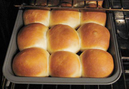 After dough has rested, shape the dough as desired (see Types of Rolls below). Shape pieces of dough into balls and place in two greased 8-inch cake pans or large baking pan. The easiest way to get rolls the same size, is to weight the dough: