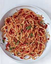 In a large pot of boiling salted water, cook the pasta until al dente. Drain, reserving 1/2 cup of the cooking liquid. In the pot, toss the pasta with the pesto, reserved cooking water and remaining 2 tablespoons of oil until the sauce clings to the pasta. Transfer the pasta to bowls, sprinkle with the bread crumbs and parsley and drizzle with olive oil. Serve.