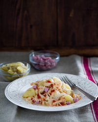 Bow-tie pasta with slices of sweet potato, diced Canadian bacon, and tomato puree form a harmonious dish of varied flavors, shapes, and colors. We use sage here, but if you don't care for it, try the same quantity of thyme instead