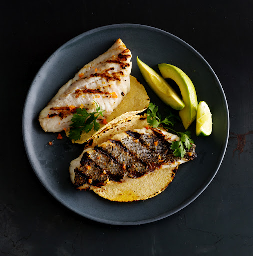 Pat fish dry with paper towels; drizzle skin side of fish with oil; spread chile-salt mixture all over skin side of fillets (if you don't like to eat the skin, coat the flesh side). Place fillets, skin side down, on grill. Cook for 5 minutes; turn fish over and grill, flesh side down, until cooked through, 1–2 minutes longer. Serve fish with lime wedges for squeezing over. If you'd like to make fish tacos, serve with avocado, cilantro sprigs, and tortillas.