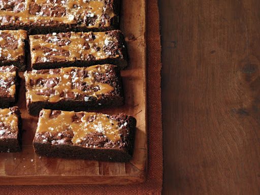 As soon as the brownies are out of the oven, place the jar of caramel sauce without the lid in a microwave and heat just until it's pourable. Stir until smooth. Drizzle the caramel evenly over the hot brownies and sprinkle with the sea salt. Cool completely and cut into 12 bars.