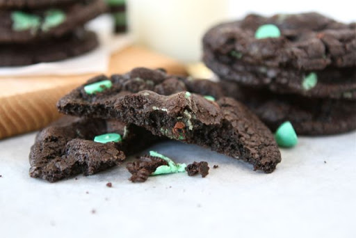 4. Slowly add flour mixture to sugar mixture and mix until flour disappears. Stir in chocolate chips, mint green chips, and chopped Cool Mint Oreos. Drop cookie dough by rounded tablespoons onto prepared baking sheet, about 2 inches apart.