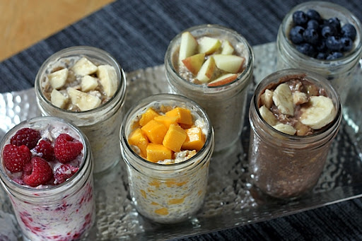 For each recipe, add oats, milk, yogurt, chia seeds and seasonings. Honey can be substituted with any sweetener. Put seal on and shake well. Add fruit and stir with a fork until mixed. Seal and refrigerate for two days or freeze for two months.