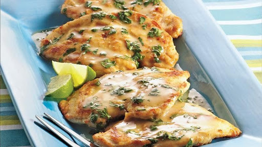 In small bowl, stir reserved 1 teaspoon flour mixture into broth. Gradually stir broth mixture and red pepper sauce into skillet. Heat to boiling; stir in lime juice and cilantro. Serve sauce over chicken.