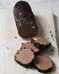 Roll the mixture into a 9-inch log and wrap in plastic. Roll the log back and forth until smooth. Unwrap the log and spread the chocolate sprinkles on the plastic wrap. Roll the log in the sprinkles, pressing to help them adhere. Wrap and refrigerate for 15 minutes.